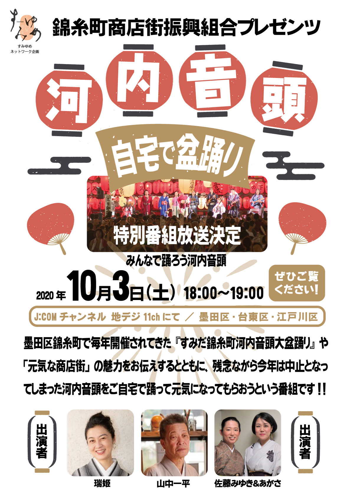 10月3日(土)18時から特別番組『錦糸町商店街振興組合プレゼンツ 河内音頭 自宅で盆踊り』をJ-COMで放送します。